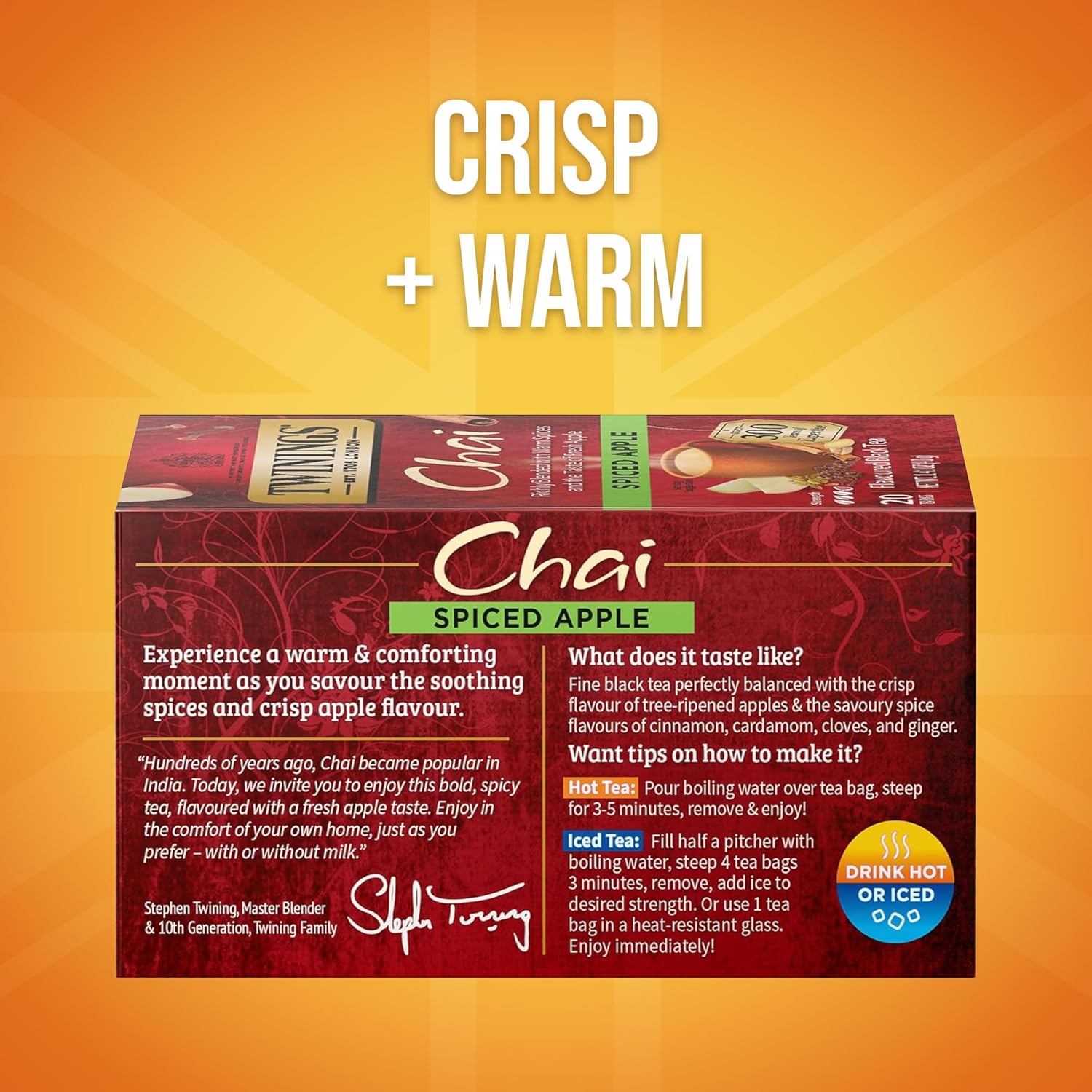 - SPICED BLACK TEA: Subtle fresh apple flavour with just the right amount of spice will take the chill away and deliver a mouth-watering tea with a rich, vibrant aroma.