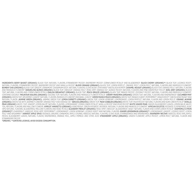 - TEA SAMPLER VARIETIES INCLUDE Berry Basket, Black Cherry, Blood Orange, Bombay Chai, Caramel Nougat, Darjeeling Quince, Earl Grey, English Breakfast, Peach Brulee, Mountain Oolong, Cherry Marzipan, Cucumber Mint, Green Mango Peach and Jasmine Green
