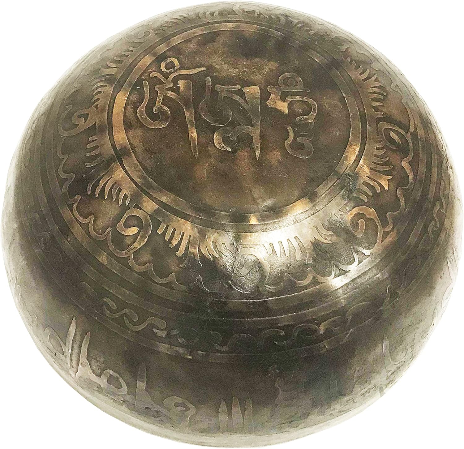- Includes Antique Bronze Auspicious Tibetan with scripts mantra engraved Healing Bowl, Wooden Mallet and Silk Cushion. Please note that cushion color may vary. The Bowl diameter is 5.5 inches, 3.5 inches tall and weighs approximately 2.0 lb.