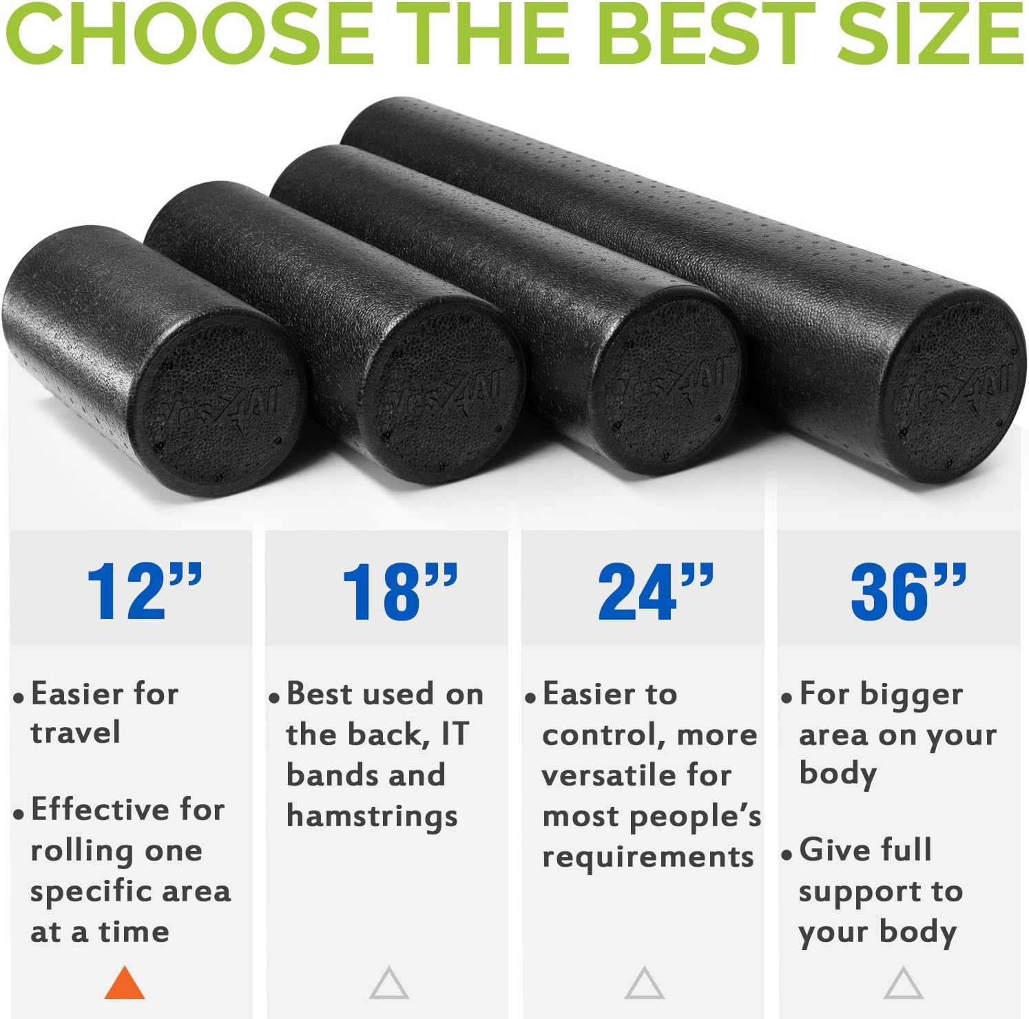 - MULTIPLE SIZES: Our yoga roller is available in four sizes 36x6 inches for full back, 24x6 inches for more versatile and easier control, 18x6 inches for smaller muscle groups, and 12x6 inches for one specific area and saving space