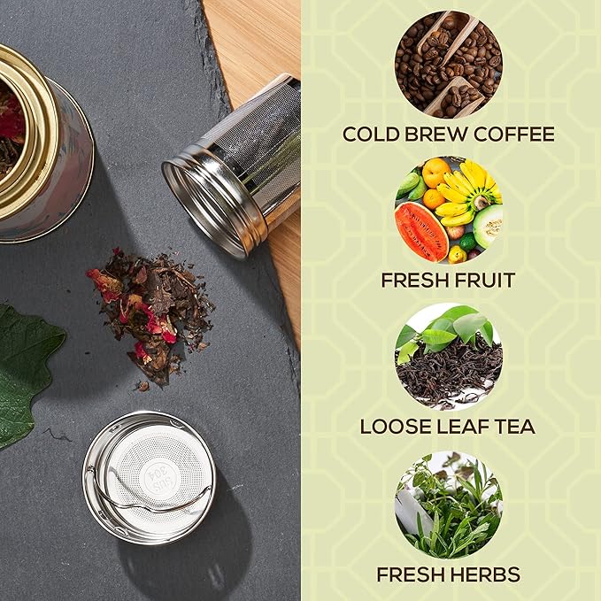- 3 Ways of Infusion with One Tumbler - Your purchase comes with a bonus 2-piece detachable tea infuser & strainer. Conveniently brew your favorite loose tea with this accessory in 3 ways - short, long, & tea bag infusion. Plus, you can use this bamboo tea infuser tumbler for your fruit infused drinks, brew hot loose-leaf tea or any herbal beverages! Ideal as an anniversary gift, a birthday gift for your eco-conscious partner, as mothers day gifts, or simply as a unique tea gift for tea lovers.