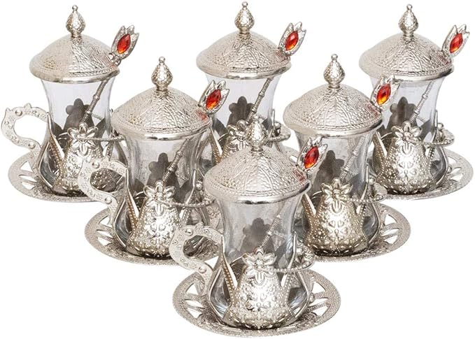Alisveristime Handmade Turkish Tea Glass Set - Traditional Turkish Motifs, Set of 6 with Lids and Bonus Tea Spoons (Silver)