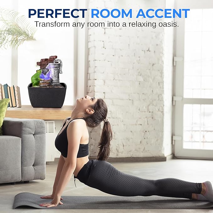 - SOOTHING RELAXATION: The modern tabletop water fountain provides soothing relaxation and tranquility. Listen to the sounds of a waterfall crashing down onto the tiers below as they gently rock you to sleep or bring you a comforting stress relief.