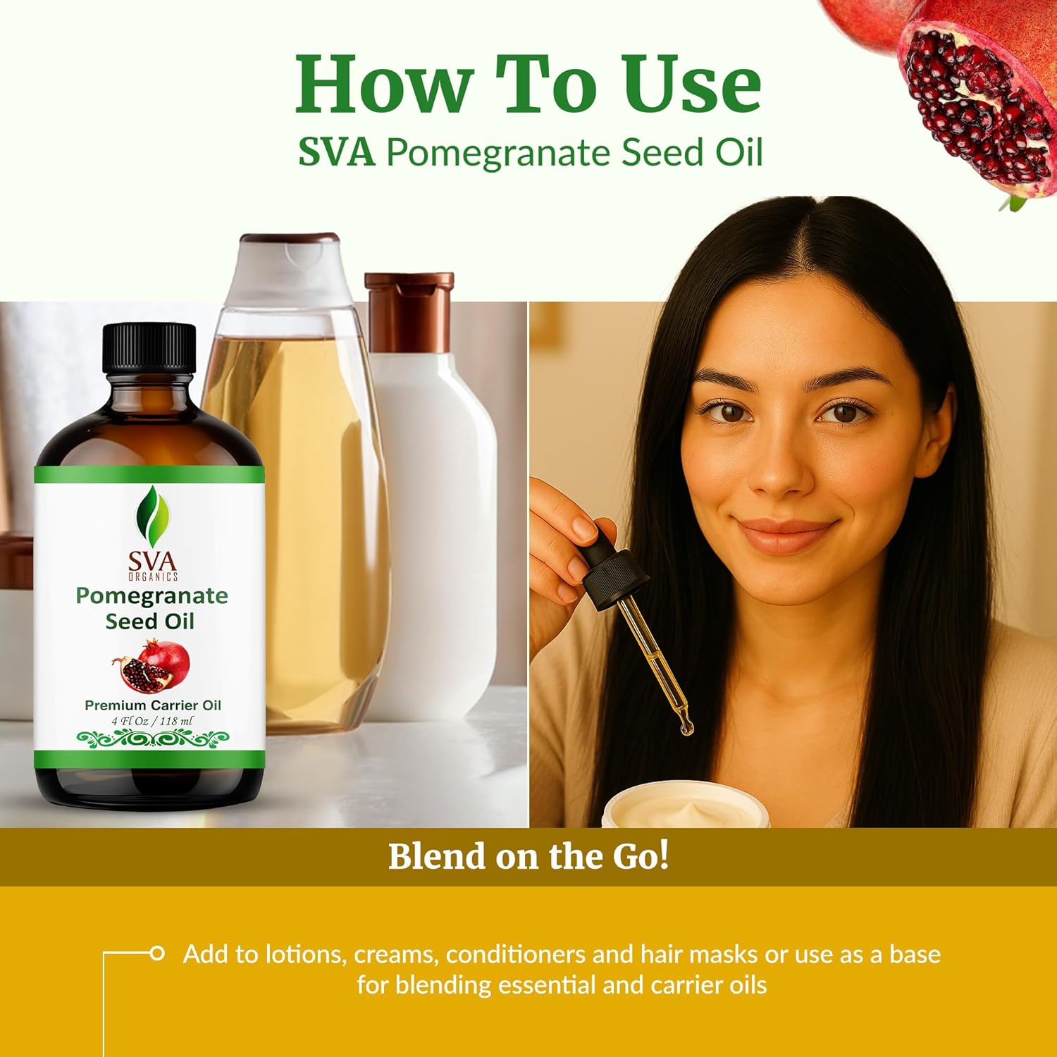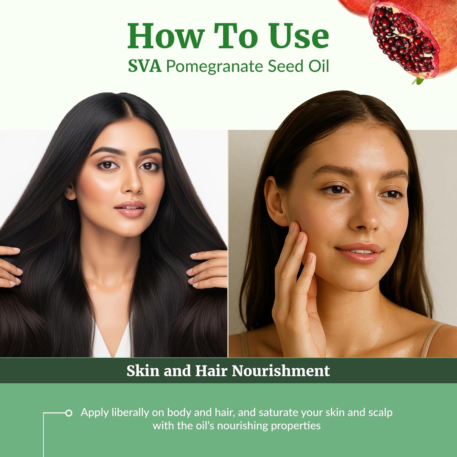 - How To Use: SVA Pomegranate Seed Oil Organic cold pressed is easy to use. Pour a few drops on your palm and gently massage your scalp and skin with it for a few minutes. Leave it for some time and wash it off with a mild cleanser. You may use Pomegranate oil for hair or skin and leave the oil overnight for better results.