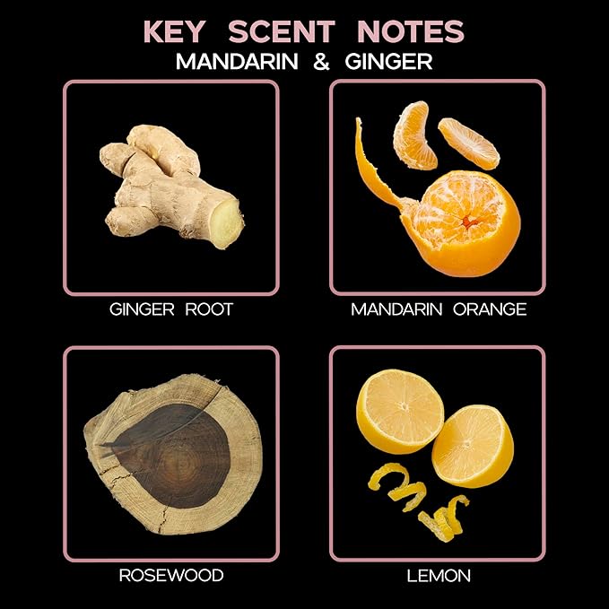 - MANDARIN & GINGER – is an energizing and warm blend of Ginger Root, Mandarin Orange, Rosewood, Jasmine, and Musk; displayed in our Modern Striped Diffuser, a sleek frosted glass bottle etched with clean vertical stripes for a minimalist yet eye-catching look, topped with a slender neck and delicate vibrant deep orange ribbon accent for a refined, timeless look; ideal for orange, coral, and golden décor