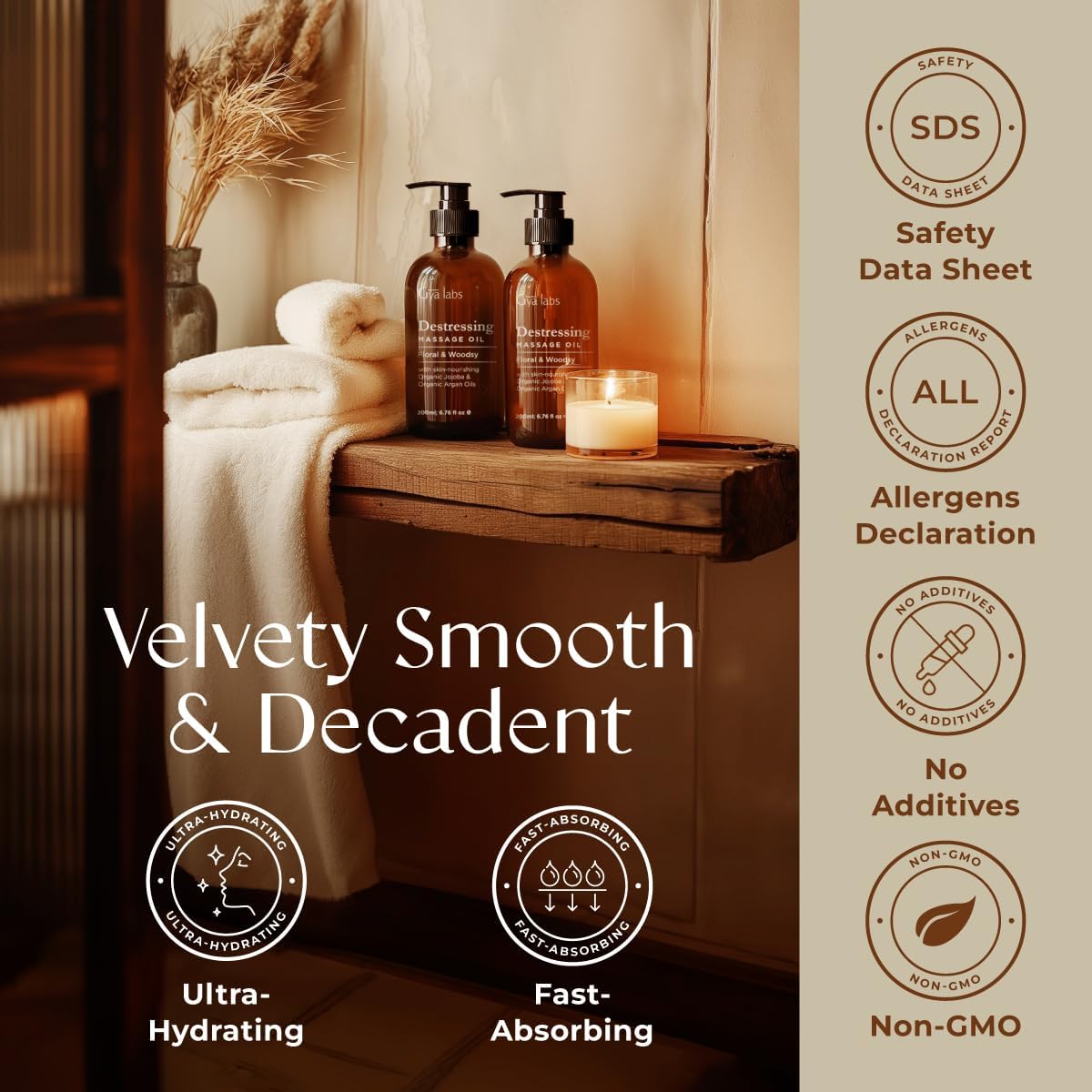 - Natural goodness. Gya Labs' Destressing Massage oil is made with premium ingredients sourced from Mother Nature. Our products do not contain hexanes, additives, sulfates and artificial fragrances. No nasties, just plant-powered self-care.