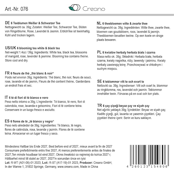 - QUALITY: Creano Blossom Teas are a branded product of the highest quality. We attach great importance to the quality of the tea, flowers, function and appearance. As a member of the German Tea Association we stand for the highest possible product safety and are subject to the "Code of Conduct".