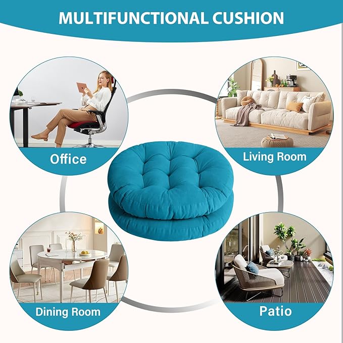 - 【SIZE】Patio Chair Cushion dimensions are 22x22x4 inch (2 Pack). Tips: Please note the round chair cushins were packed with compress bag due to long shipment. Please put the floor seat cushion exposing under the sunlight for a few hours, then the chair cushion will recover to the normal thickness soon.