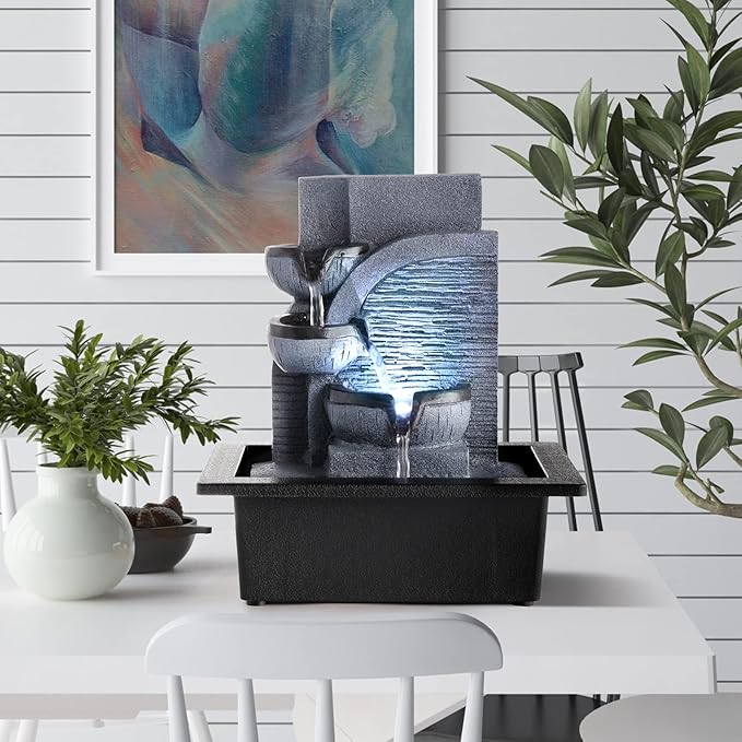 - Built-in LED Light: The fountain is lit by the LED lighting to offer a peaceful, calming glow. Water cascades down water tiers of stone-like layers creating a calming ambiance. Give your home or office a touch of style and serenity with this indoor water feature.