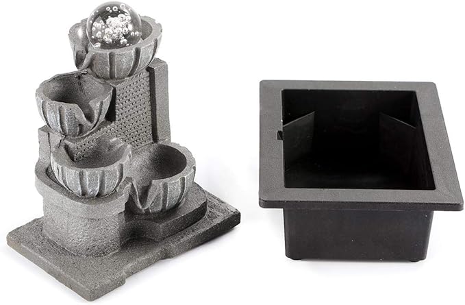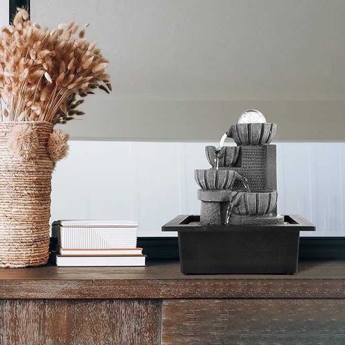 - [Decorative Water Fountains Indoor]- 4 Tier indoor tabletop water fountain with a quiet submersible pump to circulate the water and made gentle soothing sound of water for relaxing. The indoor water fountain with roll ball lights is suitable for any office, living room or modern home decor. (Size: 8.26*5.9*11.02 In)
