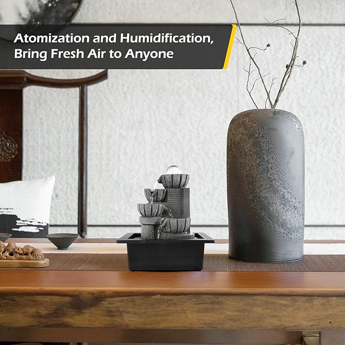 - [Easy to Use]-The portable tabletop water fountain indoor is easy to use, just add water to the indoor waterfall fountain and plug in a standard power outlet. Then you can enjoy the soothing effect of this water fountain indoor, which is very suitable for decoration in any room.