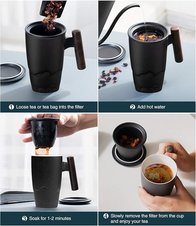 suyika Tomotime Ceramic Tea Cup with Infuser and Lid Tea Mugs Wooden Handle 400ml/13.5oz Black