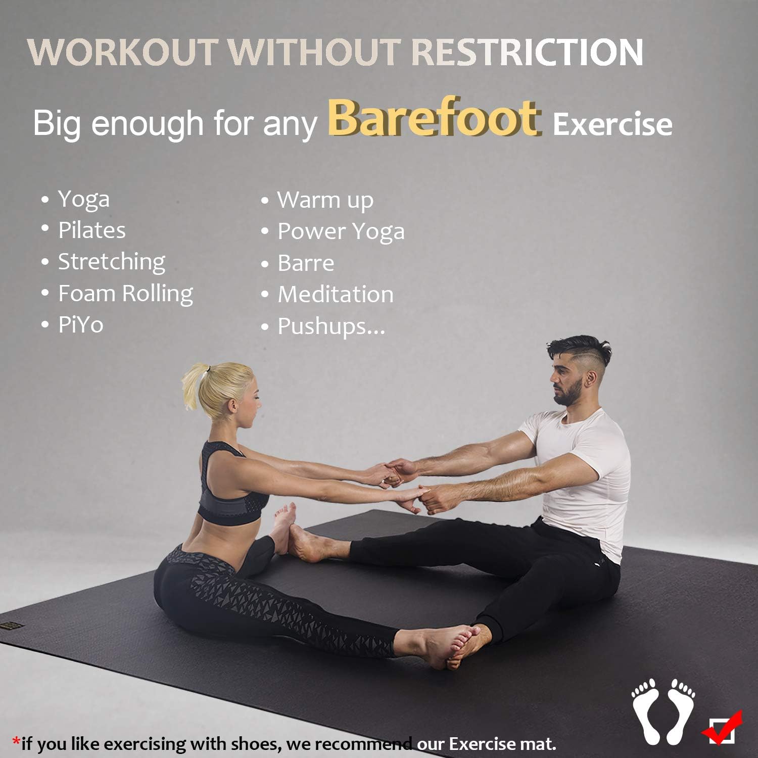 - ăWORKOUT WITHOUT RESTRICTIONăExtra long & wide for all-purpose fitness WITHOUT Shoes. Ideal for home yoga studios. Never feel restricted or limited by the size of your spacious gym mat. It can be used for any yoga pose, pilates, meditation, stretching, light cardio or other workout routines. Works great on most floor surfaces.