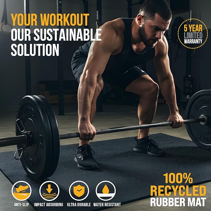 - โ 100% RECYCLED RUBBER: Made from recycled rubber tires, our non-vulcanized exercise mat minimizes environmental impact while offering a sustainable flooring solution. The material ensures exceptional durability, providing a long-lasting solution for your home gym flooring needs. Made in North America for over 30 years, this mat is a testament to our commitment to high quality and sustainable practices.