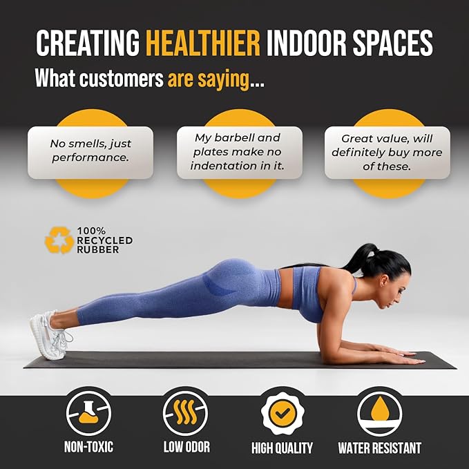 - LOW ODOR: Say goodbye to unpleasant rubber odors. Our mat is 3rd Party FloorScore Certified, ensuring the highest levels of indoor air quality. Recognized by 19 leading environmental programs, FloorScore equals fewer VOCs, contributing to healthier air. Enjoy a low-odor workout environment with our certified recycled fitness mat.