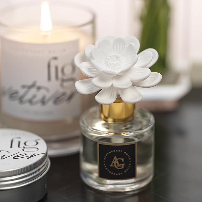 - INFUSE YOUR SPACE WITH LUXURY FRAGRANCE: Refresh your home decor with the Apothecary Guild Blush Porcelain Oil Diffuser. Our diffuser set includes fragrant oil, a beautiful porcelain flower, a metal collar cap, a silicon stopper, and a clear plastic funnel.