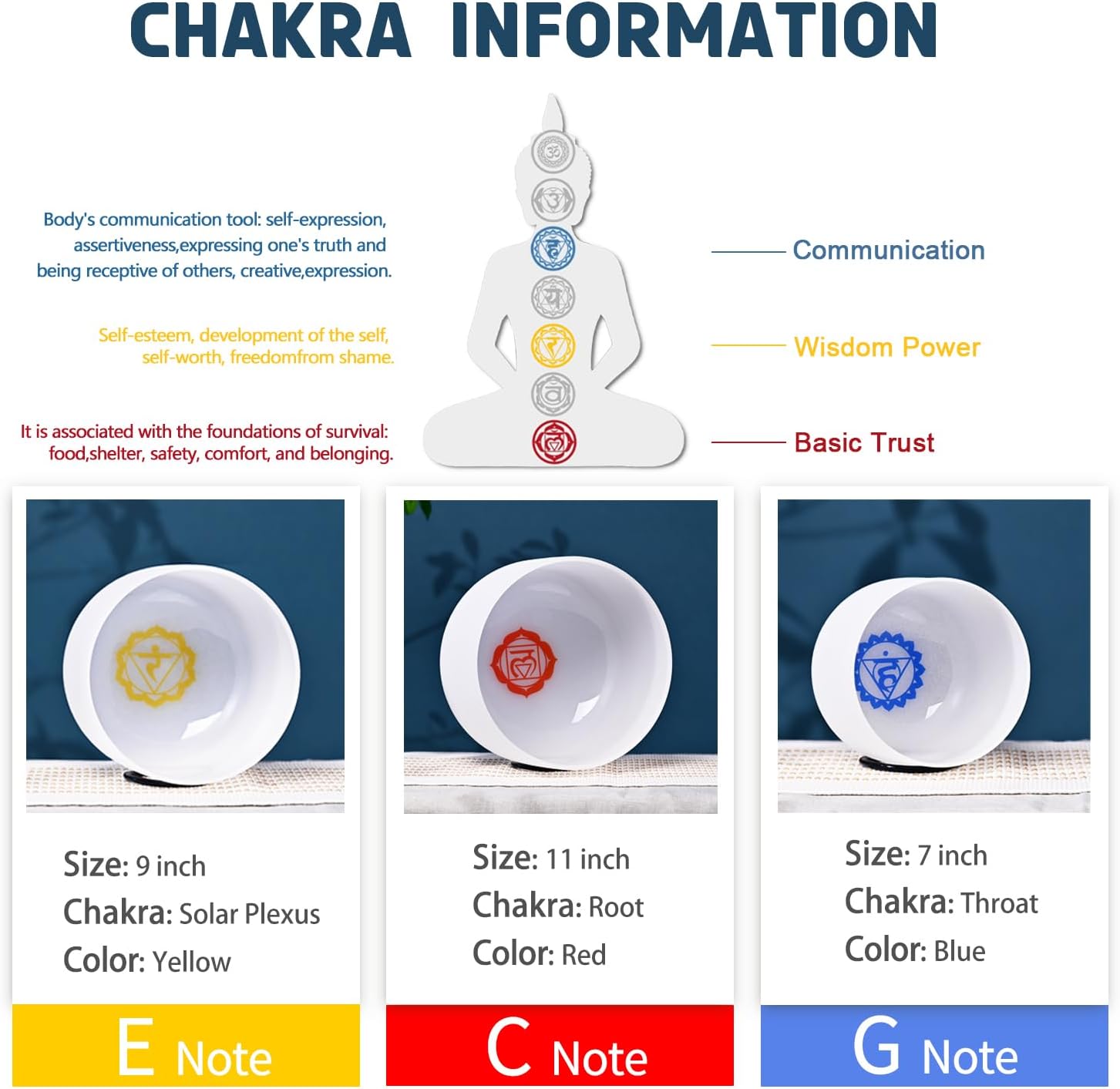 - Package include : chakra crystal singing bowls set (7 inch G note, 9 inch E note, 11 inch C note)*1, Crystal Singing Bowls Carrier Bag*1, Suede Stick*1, Rubber Mallet*1, O-ring*3