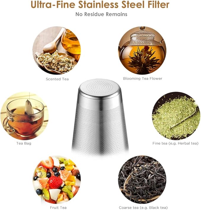 - Prevent Burns ----- The button on the lid is made of plastic, which prevents scalding when removing the lid. The ultra-fine stainless steel strainer is equipped with a handle for easy extraction and prevents dirt and scalding
