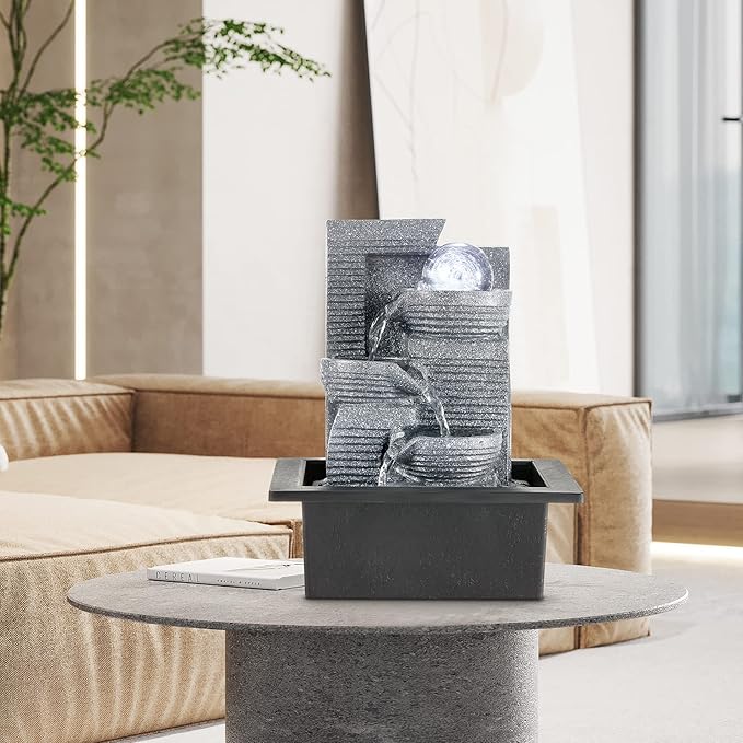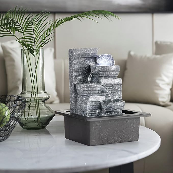 - Built-in LED Light: The rolling ball of fountain is lit by the LED lighting to offer a peaceful, calming glow. Crystal-like orb spins as water cascades down water tiers of stone-like layers creating a calming ambiance. Give your home or office a touch of style and serenity with this indoor water feature.