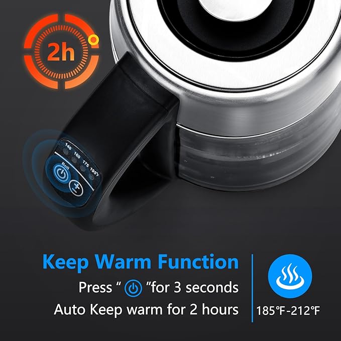 - 【Fast Boil and Keep Warm】 With the performance of 1500W power, the water heater kettle allows the water to heat up and boil quickly in a few minutes. Save your time for waiting. The glass kettle with the keep warm function can maintain your desired beverage temperature at 85-100℃ (185-212℉) for 2 hours, which can provide the appropriate temperature for fully brewed to get a better flavor.(Tip: Press and hold 100℃ button for 3s, the red indicator light will flash, then enter keep warm mode)