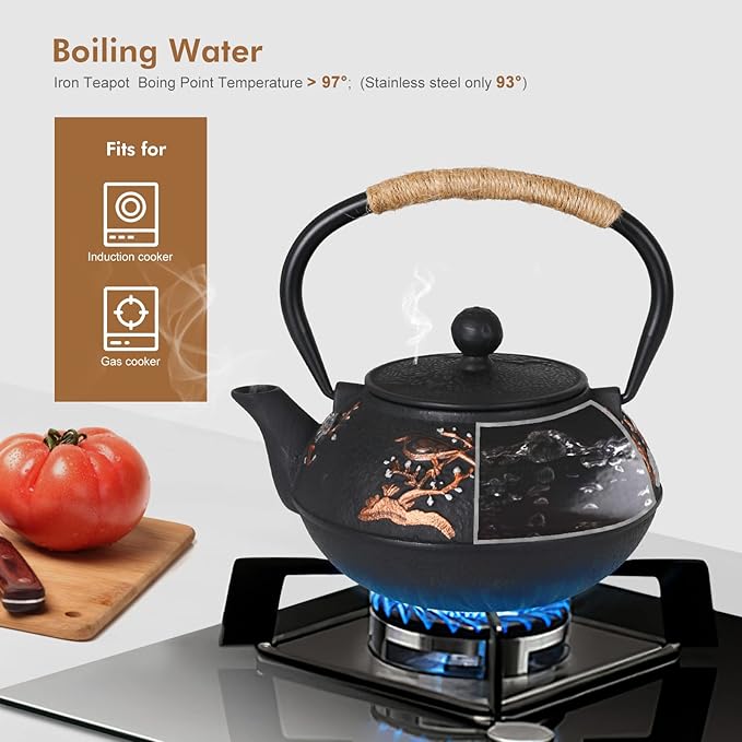 - 【IRON-PREVENT ANEMIA】Selected from RAW IRON, undergone 1500 ℃ high temperature melting,casting,and burning above 5 hours, Tovacu cast iron teapot is hard and durable.Iron teapot was recognized to be a best kitchenware to boil water due to its SWEET and SOFT water flavour and Fe2+ release,which supplement human’s Iron needed and prevent anemia.In additions, Cast iron tea set is suitable for cooking various teas such as fruit tea, black tea, Pu'er tea.