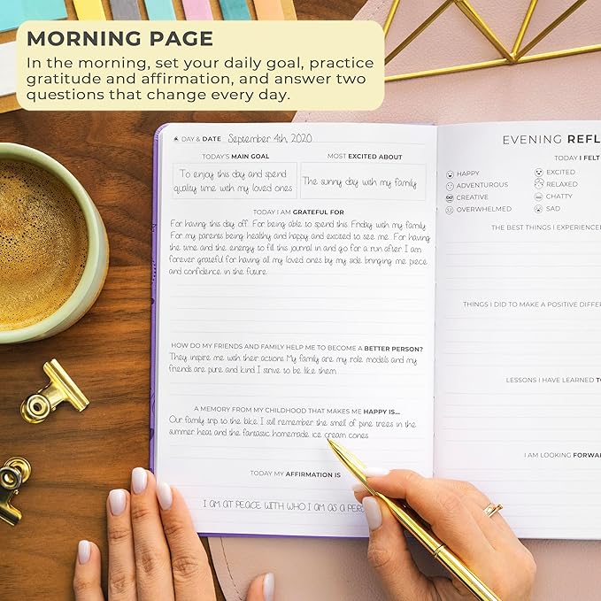 - STIMULATE GROWTH WITH DAILY REFLECTION: Reflect on your day and foster self-awareness with evening reflection pages and regular weekly exercises.