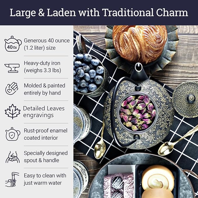 - Crafted by Hand from Start to Finish: Our black tea pot is more than just a kettle; it's a handcrafted piece of art; Each black tea kettle is molded from heavy-duty iron, carefully hand-painted, and beautifully engraved with multiple leaves, symbolizing health and happy relationships