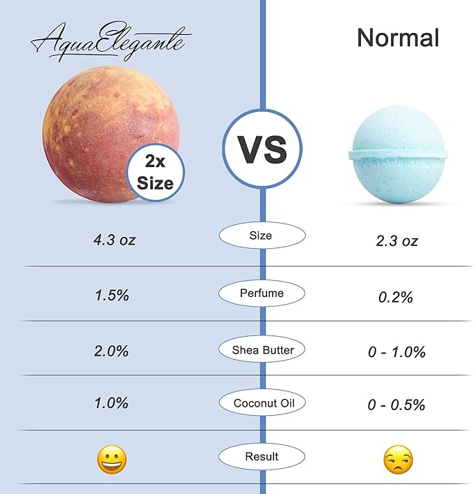 - The Main Complaint Of Other Bath Bombs Is - that the scent is too light. It goes away as soon as the bath bomb hits the water. That's because most bath bombs have just enough scent to only smell good in the box. In contrast, these Aqua Elegante Bath Bombs have more than 10 Times the Fragrant Oils in normal bath bombs. Each bathbomb is individually wrapped in BPA-free plastic to preserve freshness. What this means to you is a soothing fragrance that lasts throughout your bath.
