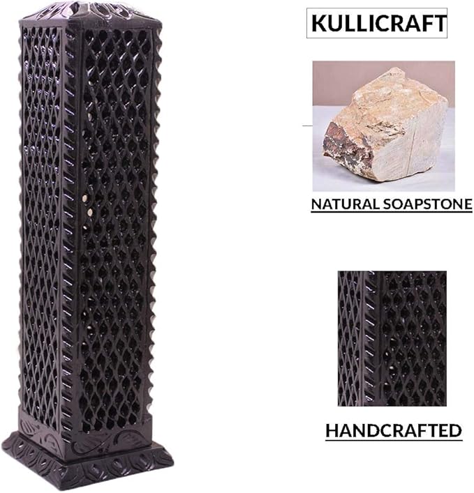 - Handcrafted Black Soapstone Incense Holder Tower – Intricately hand-carved square tower design with traditional jaali (lattice) patterns; made from solid natural soapstone with a polished black marble finish, giving each piece unique stone veining and artisanal charm.