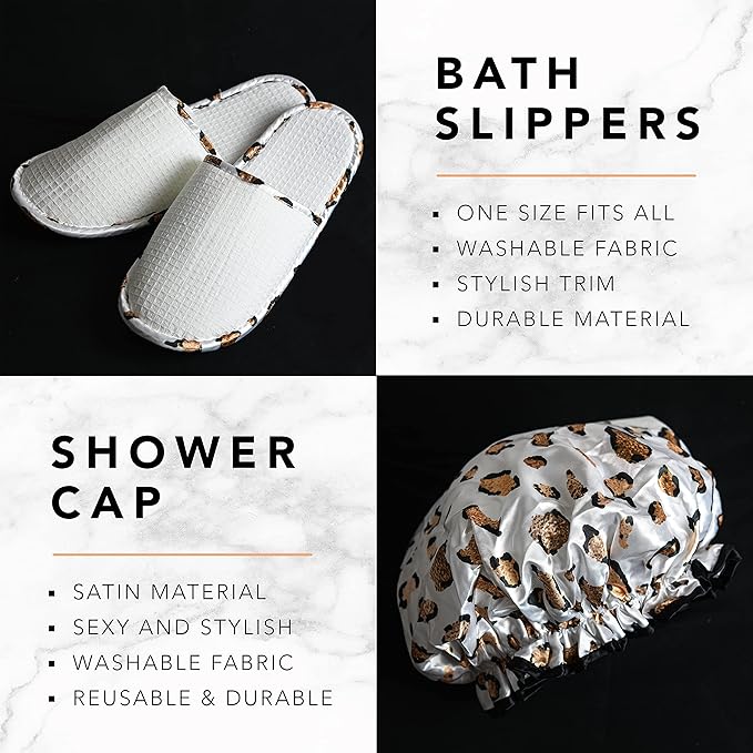 - 21 PIECE SET OF FINEST SELF-CARE PACKAGE - Give your mind, body, and soul a relaxing break! Our Bath Set contains Shower Gel, Bubble Bath, Body Lotion, Body Scrub, Bath Oil, Bath Bomb, Handmade Soap, Shower Steamer, Spa Candles, Bath Salt, Organic Lip Balm, Satin Shower Cap, Satin Eye Mask, Insulated Tumbler, Leopard Design Bath Slippers, Tweezer, Exfoliating Gloves wrapped in a Velvet Leopard Print