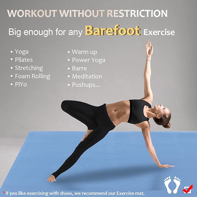 - 【WORKOUT WITHOUT RESTRICTION】Extra long & wide for all-purpose fitness WITHOUT Shoes. Ideal for home yoga studios. Never feel restricted or limited by the size of your spacious gym mat. It can be used for any yoga pose, pilates, meditation, stretching, light cardio or other workout routines. Works great on most floor surfaces.