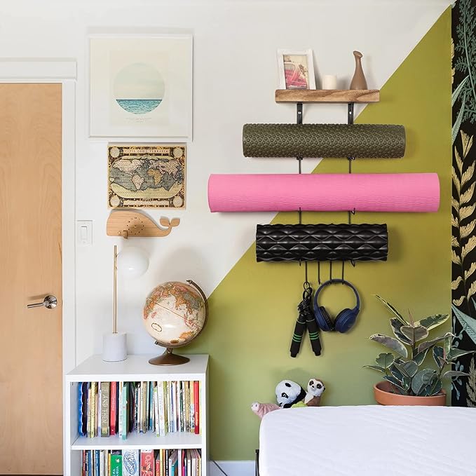 - Home Gym Accessories: This yoga mat holder can store your yoga mats, foam rollers, exercise bands very well and more at your fingertips. It is a nifty display rack, not only display your gym equipment, but also display your bathrobes and blankets. The wooden floating shelves can also display small objects such as yoga block, picture frames, water cups, etc., to add color to your room.