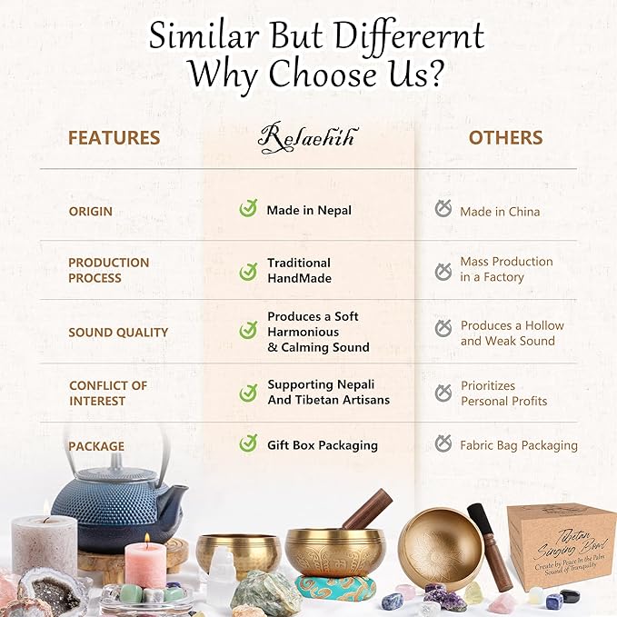 - Rooted in Himalayan Heritage: These singing bowls are crafted in Nepal, reflecting deep cultural and historical significance; They are symbols of Eastern philosophy and spirituality