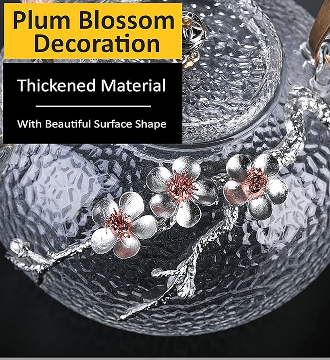 - ADMIRABLE VISUAL BEAUTY: It featured a beautiful glass lid on the top that makes the entire teapot look extremely elegant. The silver plum flower design across half the teapot creates a truly stunning visual effect, and the hammered glass finish creates a shimmering effect when the tea is poured. The simple elegance of this teapot is stunning whether it's in use or on display - perfect for the teapot collector!