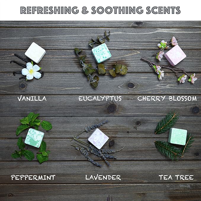 - BALANCED AROMATHERAPY: Our Shower Steamer Tablets set offers a versatile mix of well-balanced fragrances for aromatherapy, from stimulating & invigorating to calming & soothing. Our Steamers boasts an all-natural formulation, which frees from preservatives that are commonly used in cosmetics. They are 100% Paraben and Cruelty Free.