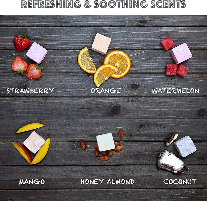 - LUXURIOUS 12 MARBLE SHOWER MELTS: Relax and unwind with our Deluxe 12 Piece Shower Vapor Tablets Set that includes 12 Natural & Organic Flavors: Mint, Eucalyptus, Lavender, Coconut, Honey Almond, Watermelon, Strawberry, Vanilla, Tea Tree, Orange, Cherry Blossom, Mango. 50g each.