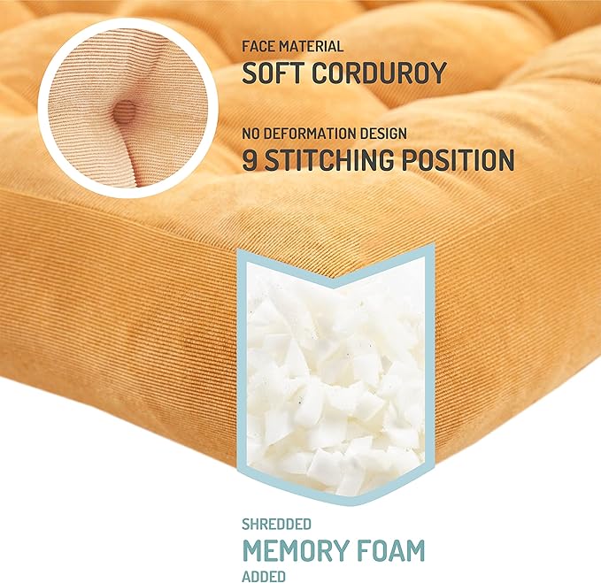 Degrees of Comfort Meditation Floor Pillow, Square Large Pillows Seating for Adults, Tufted Corduroy Cushion for Living Room Tatami, Orange Yellow 22x22 Inch