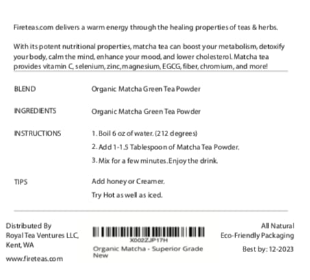 - RELAXING & SMOOTH MATCHA GREEN TEA POWDER: Known for its soothing effects; the Fire Tea Green Matcha powder contains herbal ingredients to soothe your body, and mind and refreshes your health and well-being.