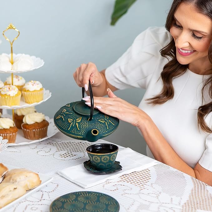 7PC Japanese Tea Set. "KIYOSHI Green" Cast Iron Tea Pot with 2 Tea Cups, 2 Saucers, Infuser and Teapot Trivet. Ceremonial Matcha Accessories