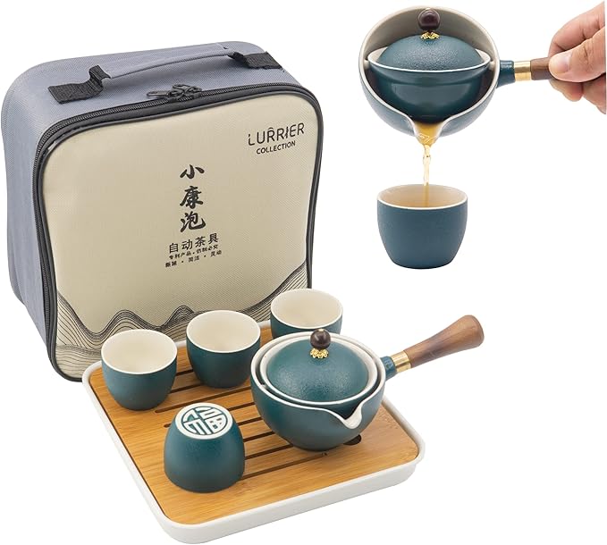 LURRIER Porcelain Chinese Gongfu Tea Set,Portable Teapot Set with 360 Rotation Tea maker and Infuser,Portable All in One Gift Bag for Travel,Home,Gifting,Outdoor and Office (Green)