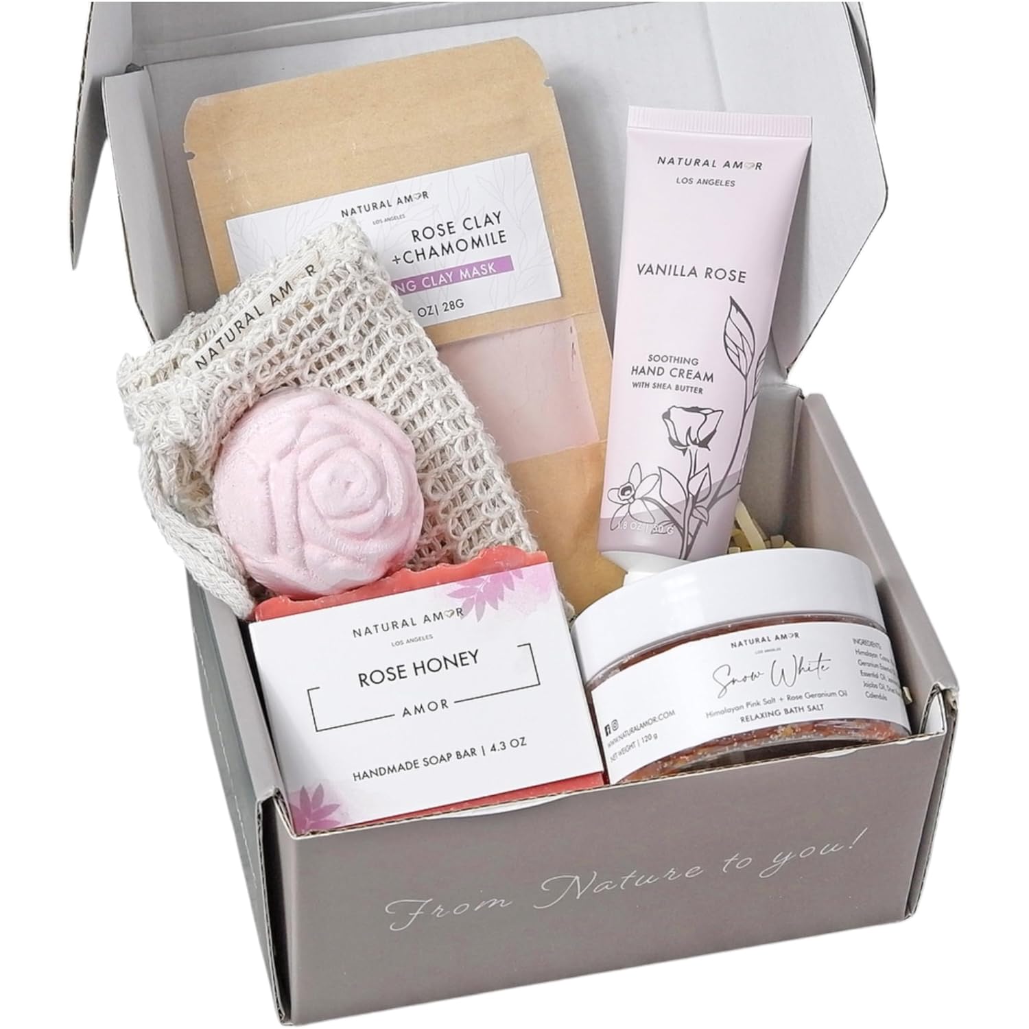 Natural Amor Spa Gifts for Women,Luxurious Rose Scent Bath gift for her, 6pc Bath & Body gift including Soap Bar, Bath Bomb, Bath Salt