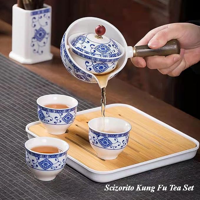 - [Design]: Our Scizorito Travel tea set use 360 degree suspension design, the filter and teapot are detachable by rotation, the suspension design does not fall, the wooden handle turns the water out, creative design, easy to use.The size of the Kung Fu tea set is a little small, please purchase with caution.