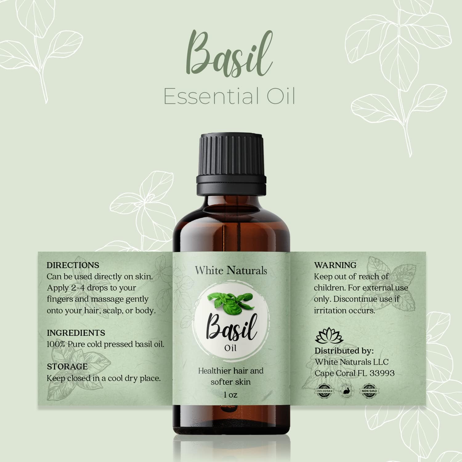 - The essential basil oil is vegan, non-GMO, and perfect for everyone. Beneficial effects: One of the best parts about our diffuser essential oils is that they are an excellent ally for stronger hair and softer skin. It can fill you with energy, peace, and relaxation within minutes