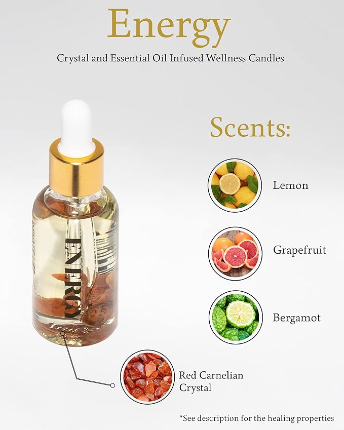 Crystal Infused Essential Oil Vial, 1 Oz, Energy - Red Carnelian Crystal Infused - Scents of Lemon, Grapefruit, & Bergamot - Aromatherapy Oils, Massage, Stress Relief
