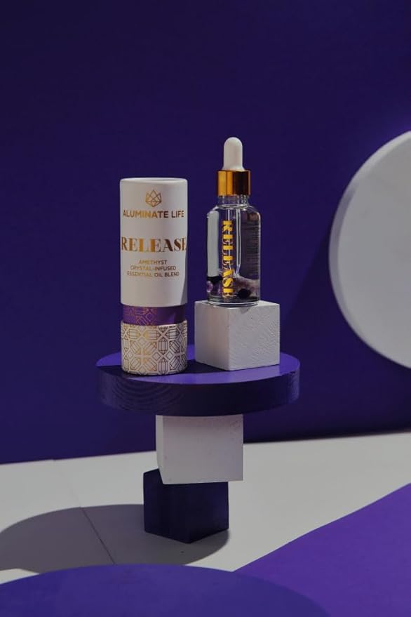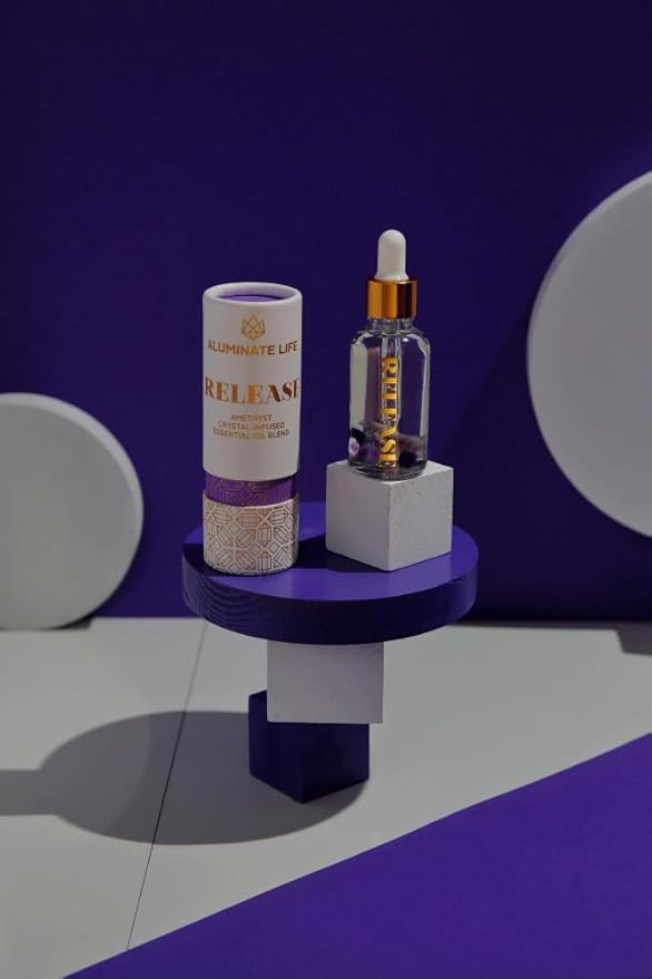 Crystal Infused Essential Oil Vial, 1 Oz, Release - Amethyst Crystal Infused - Scents of Lavender, Bergamot, & Frankincense - Aromatherapy Oils, Massage, Stress Relief