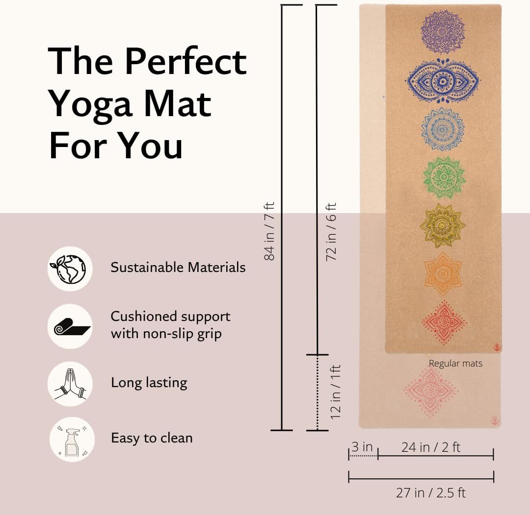 Shakti Warrior Chakra Cork Yoga Mat - Extra Long & Wide, Non Slip, Non Toxic, Great for Yoga, Pilates & Workout (84 x 27 x 2mm Thick)