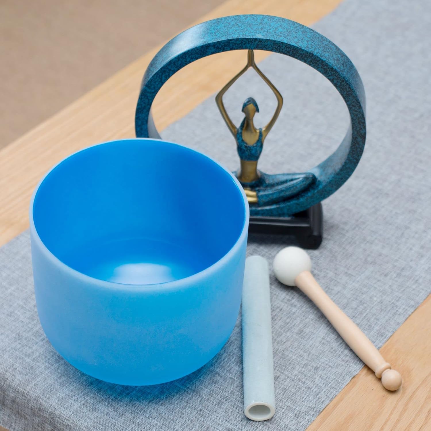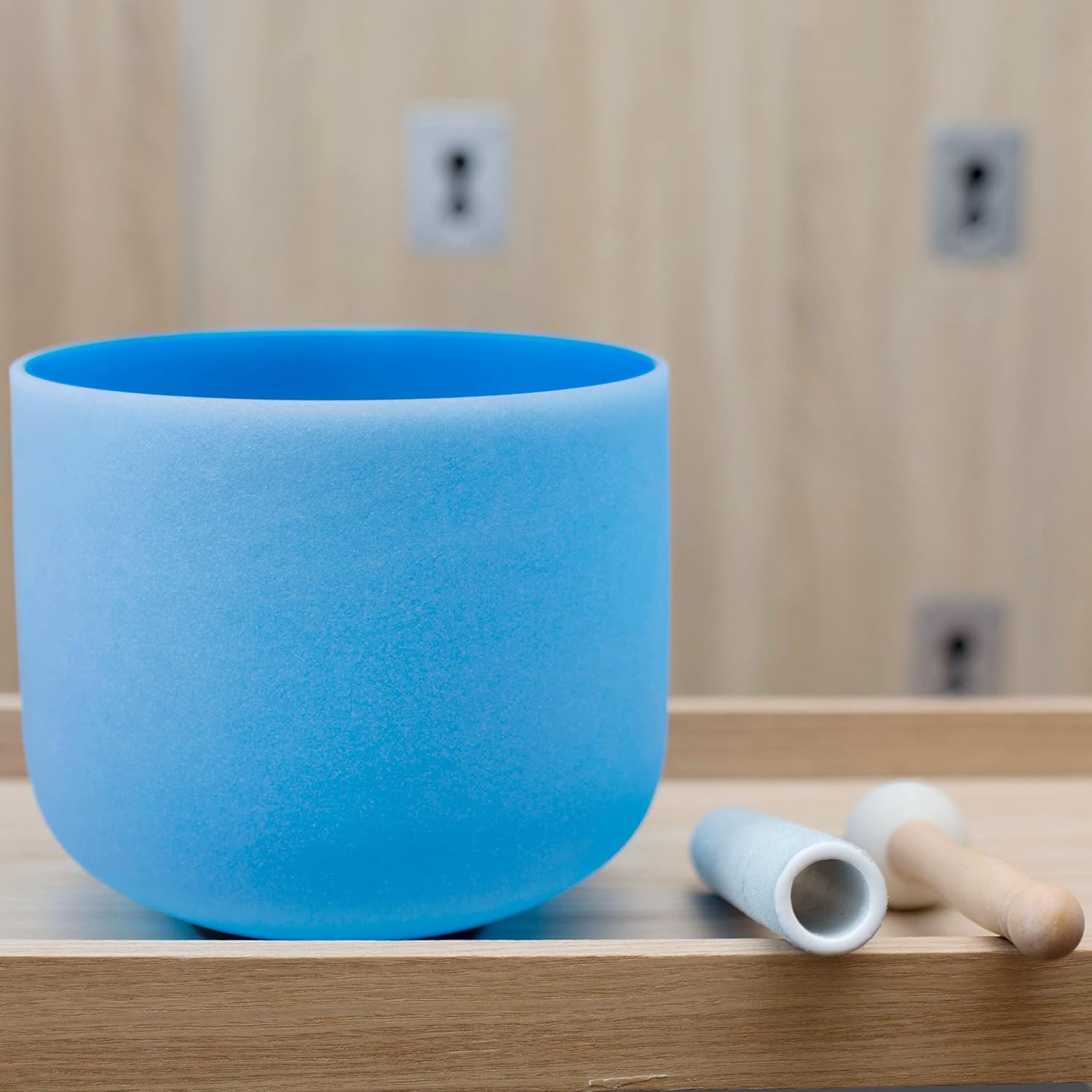 - Package includes: 1 * 8 inch wide blue high quality crystal singing bowl, 1 * thick cowhide suede striker, 1 * rubber mallet, 1 * one O-ring