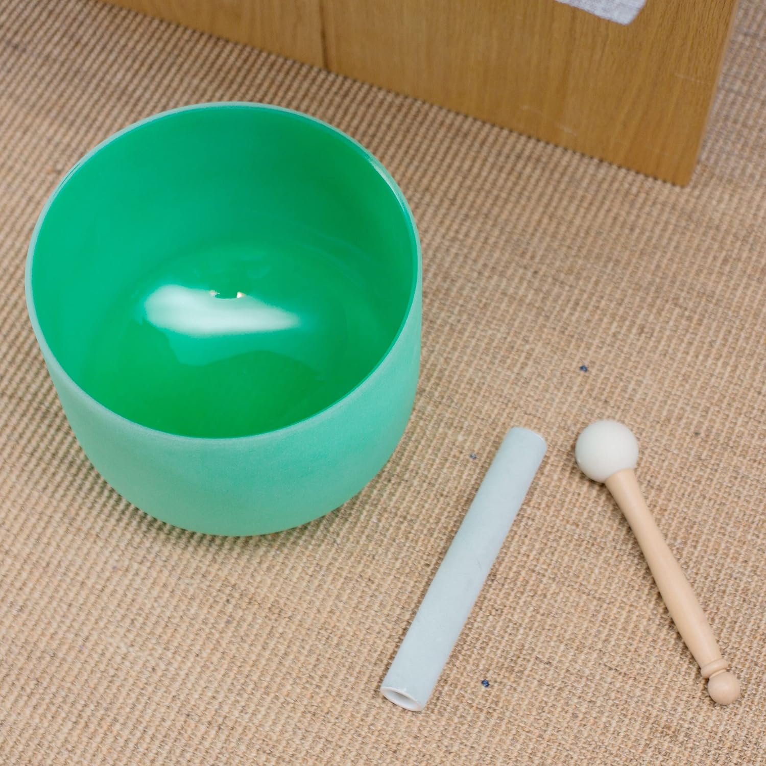 - Package includes: 1 * 9 inch wide green high quality crystal singing bowl, 1 * thick cowhide suede striker, 1 * rubber mallet, 1 * one O-ring