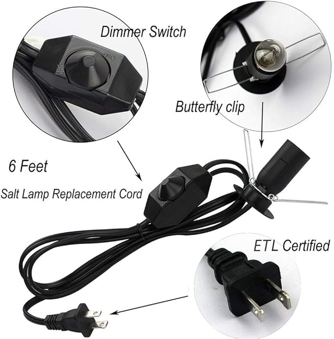 - 【2-Pack Salt Lamp Cord with Dimmer Switch】 5-foot-long Original Cord comes with a handy dimmer switch, which can help you adjust the brightness of the lamp. Specifically designed for salt lamps to hold any 15~25 Watt E12 light bulbs. Suitable for 110V, 2A, ≤200W current.