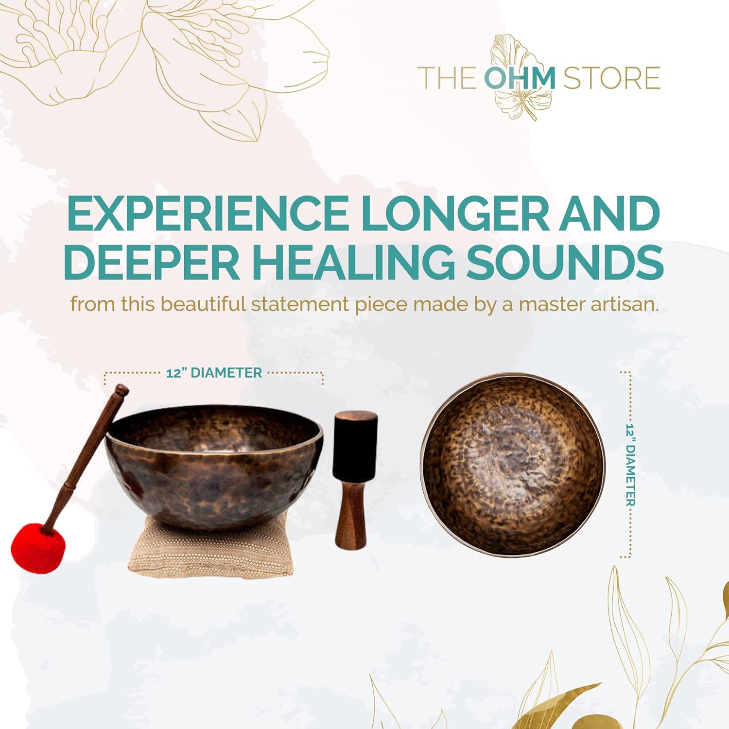 Large Tibetan Singing Bowl Set by Ohm Store — Jupiter Pure Bronze Meditation Sound Bowl 12 Inches, 2 Mallets and a Cushion — Sound Bath Instrument to Enhance Yoga, Prayer, Chakra Healing, and Mindset